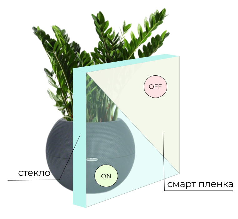 smart стекло триплекс. То есть бутерброд из двух обычных стекол и начинкой в виде умной смарт пленки. Именно smart пленка отвечает за прозрачность и непрозрачность стекла.